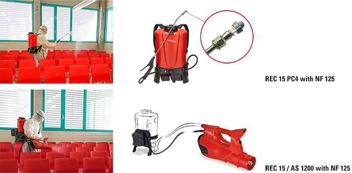This modified version of the AS1200 air assisted sprayer includes an 50 micron nozzle providing the small droplet size to be used with most sanitising solutions (please check with manufacture of sanitising solution) in combination with the Birchmeier Accu-Power line REC 15, battery powered sprayers it becomes a powerful tool for sanitising spraying.